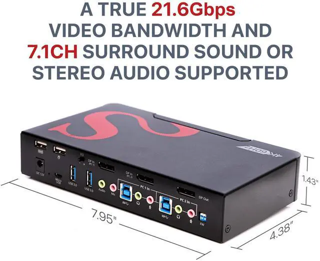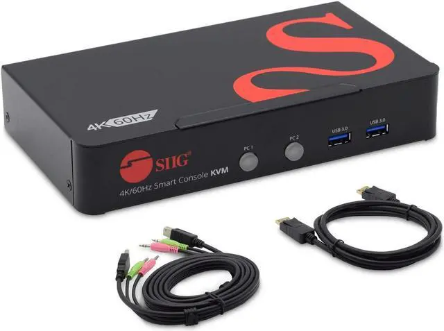 Contents: 2-Port DisplayPort 1.2 4K Smart Console KVM Switch with USB 3.0 Multi-Media Power Adapter + Power cord DisplayPort 1.2 cable, 1.8 meters (2pcs) 2 x USB 3.0 + MIC + Stereo 3-in-1 cable, 1.8 meters User