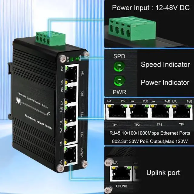 - *Dual Redundant Power Input 12-48V DC, Support 2 channel DC12V-48V redundant power inputs and auto failover, ensure high reliability networking system. DC 12~48V input and PoE 48V output, can be uesd in PoE cameras, wireless access points, access control etc With reliable and simple operation against vibration and shock, and wide operation temperature range, it could match a variety of harsh environment.