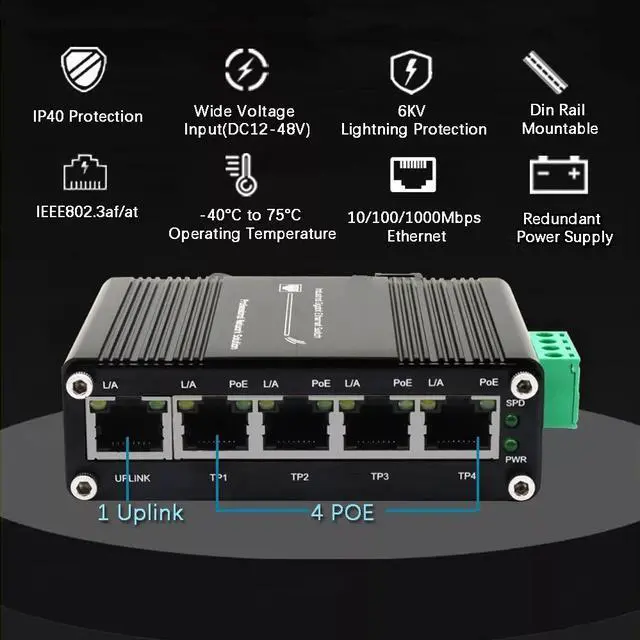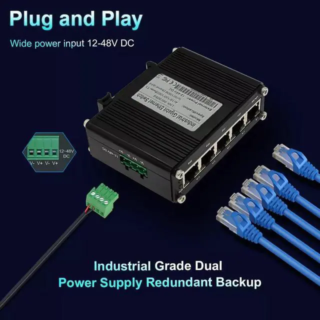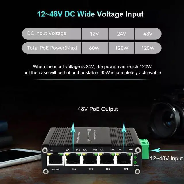- *Dual Redundant Power Input 12-48V DC, Support 2 channel DC12V-48V redundant power inputs and auto failover, ensure high reliability networking system. DC 12~48V input and PoE 48V output, can be uesd in PoE cameras, wireless access points, access control etc With reliable and simple operation against vibration and shock, and wide operation temperature range, it could match a variety of harsh environment.