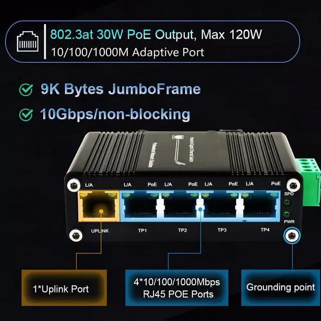 Industrial 5 Ports Gigabit Solar POE Switch with DC12V-48V to DC48V Voltage Booster, Supports 4 x IEEE802.3af/at 30W POE Ports @120W, Compact POE Power Supply for Solar Power/RV Truck/VoIP Systems.