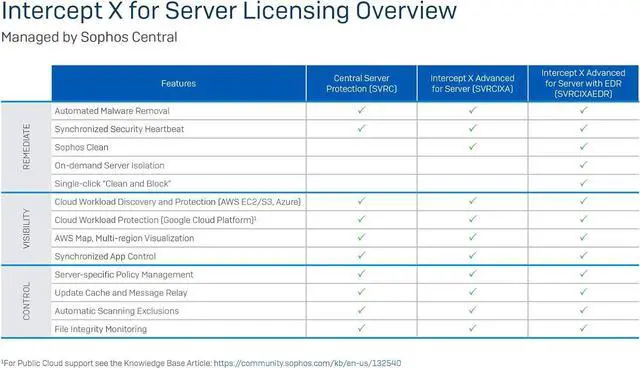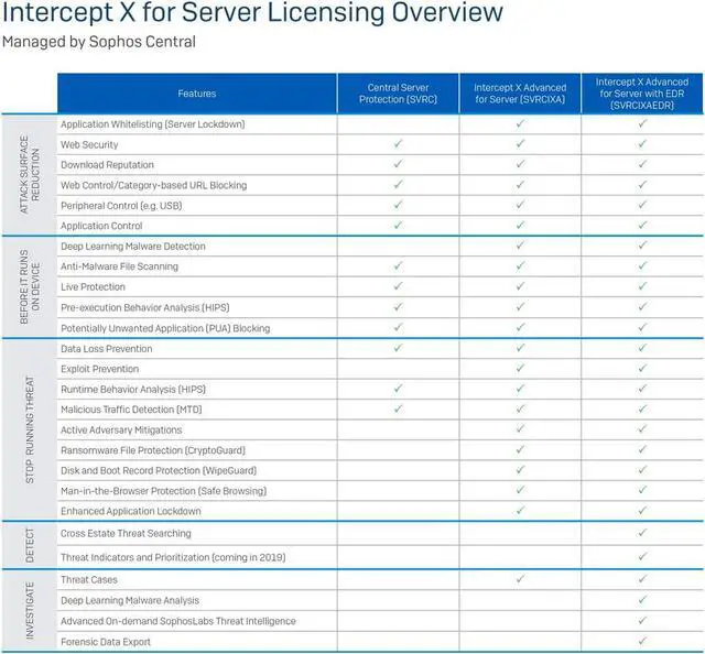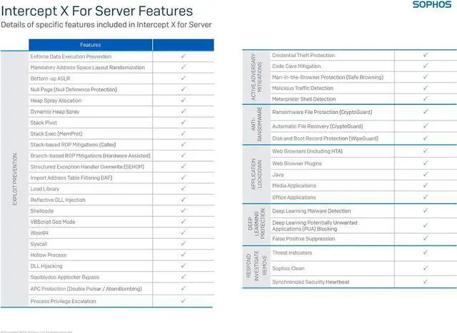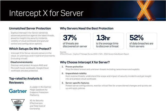 Intercept X for Server offers a comprehensive, defense-in-depth approach using deep learning malware detection, exploit prevention, anti-ransomware technology, application white listing, active adversary protection, and in-depth root cause analysis.