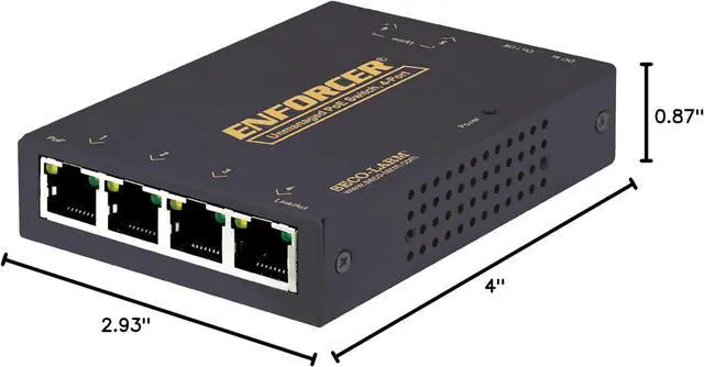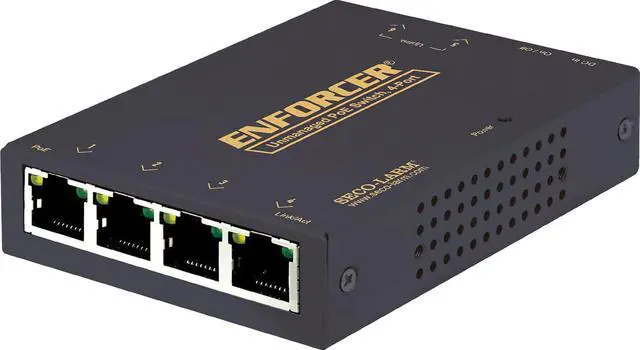 Seco-Larm NS-104UT-MAQ Enforcer 4-Port Unmanaged PoE Switch; Supports up to 10/100B-T; IEEE 802.3x Flow Control; Plug-and-play Installation; 48/57 VDC; 4 Downlink, 2 Uplink; 55W PoE Capacity