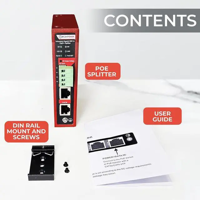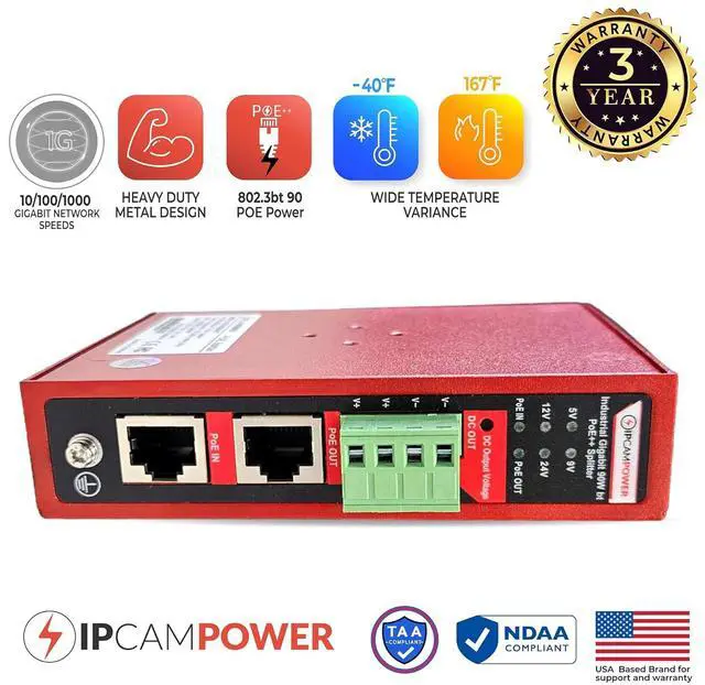 The IPCamPower IPCP-PS90-BT1 is one of the most useful and powerful POE Splitters in the industry. The POE Splitter takes incoming POE and converts it to your choice of a DC Voltage Output of 5V, 9V, 12V or 24V. In addition to the DC Output, the splitter outputs POE by passing through the original POE Input. This gives you the option to power DC devices as well as POE devices simultaneously. The POE Input can accept up to 90 watts of 802.3bt POE Power. The maximum wattage output is 72 Watts and is shared between the DC and POE Output. Both POE Input and Output comply with 802.3af/at/bt POE Standards. The Ethernet Ports are Gigabit rated 10/100/1000 Mbps for fast and officiant data transfer. For added convenience, the splitter has 2 DC outputs for powering multiple DC powered Devices. With its industrial grade build, the device can withstand wide temperature variances of -40 to 167 degrees fahrenheit. The device is useful for a multitude of scenarios such as POE Lighting, Access Control, and other unique situations.