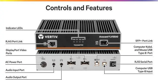 The Vertiv Avocent LongView 5500 (LV5500) and 5520 (LV5520) High-Performance KVM Extender is the latest in the Avocent high-performance KVM family of products. The Vertiv Avocent LV5500 and LV5520 are point-to-point high performance KVM extenders that provide 24-bit color graphics over a single head or dual head up to 4K@60Hz. Along with providing real-time access, local port pass through, and HD analog audio, the LV5500 provides an effortless and automatic connection for up to two users, local and remote, over the IP network without the need for extensive manual setup. Increase business security with signed upgrade files and firmware updates from a single USB flash drive. The LV5500 and LV5520 are ideal for broadcasting, control centers, and other industries requiring high performance, 4K video.