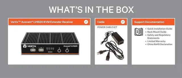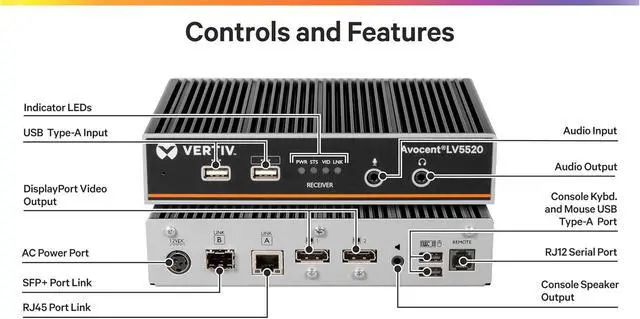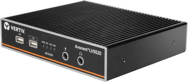 The Vertiv Avocent LongView 5500 (LV5500) and 5520 (LV5520) High-Performance KVM Extender is the latest in the Avocent high-performance KVM family of products. The Vertiv Avocent LV5500 and LV5520 are point-to-point high performance KVM extenders that provide 24-bit color graphics over a single head or dual head up to 4K@60Hz. Along with providing real-time access, local port pass through, and HD analog audio, the LV5500 provides an effortless and automatic connection for up to two users, local and remote, over the IP network without the need for extensive manual setup. Increase business security with signed upgrade files and firmware updates from a single USB flash drive. The LV5500 and LV5520 are ideal for broadcasting, control centers, and other industries requiring high performance, 4K video.