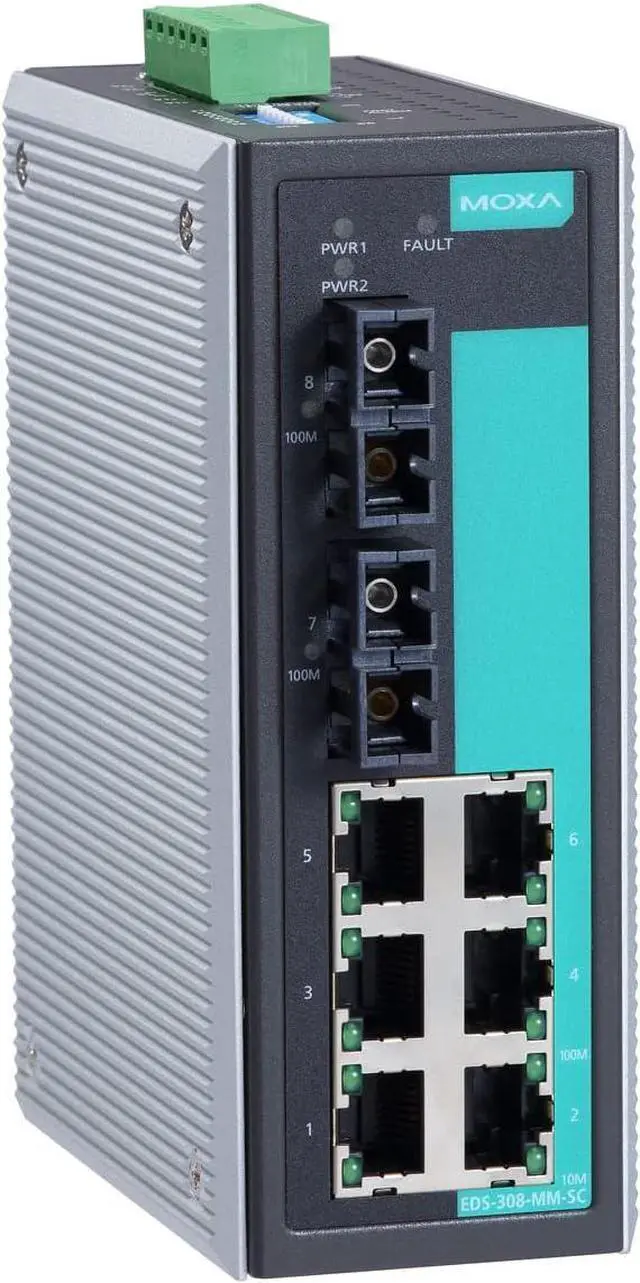 EDS-308-MM-SC , Industrial Unmanaged Ethernet Switch with 6 10/100BaseT(X) Ports , 2 Multi Mode 100BaseFX Ports , SC Connector , -10 to 60°C ( Moxa )