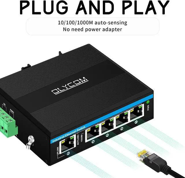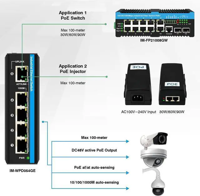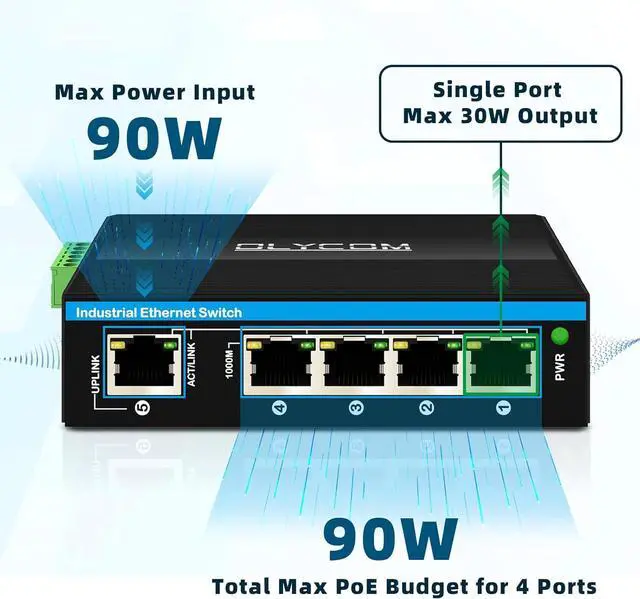 1. FULL GIGABIT POE EXTENDER: this 5-port industrial PoE extender supports 1 PoE in (Max 90W) and 4 PoE out (Max 30W each port). It is 10/100/1000M auto-sensing and the transmission distance can reach 330ft(100m).