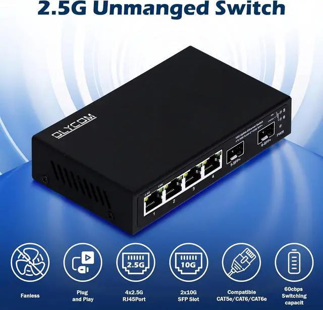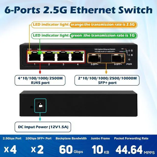 6 Port 2.5G Unmanaged Network Switch 4x2.5GBase-T Ports 2x10G SFP+ Fiber Switch 60Gbps Bandwidth Desktop/Wall Mount Compatible with 100/1000/2500Mbps (6port| 4×2.5G + 2×10G SFP+)