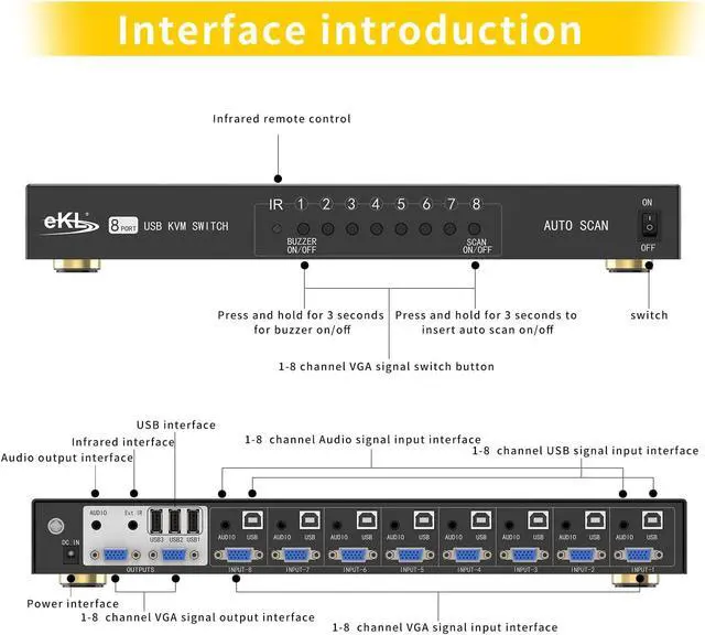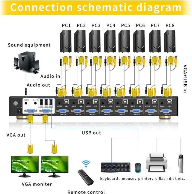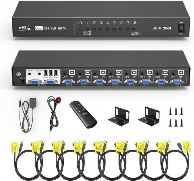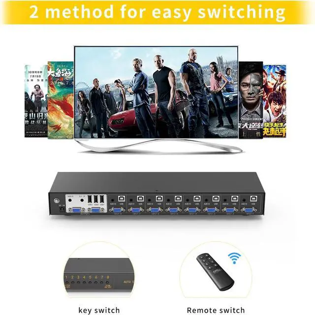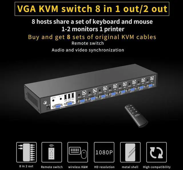 Supports 8 PCs vgainput 2 vga duplication output(NOTE: not supports extended display), max.resolution 1920x1440, a set of the keyboard and mouse sharing 8 PCs.supports WIN DOWS9X,NT, WIN2000, WINXP, WIN7, LINUX, NOVELL and other operating systems.Easy to install andOperate, 8 USB+VGA combined KVM cables included (Audio cables not included),high quality and durable cables to offer security and stability in theprocess of access and operation.Remote controlswitching and push button switching, Rack mount design.