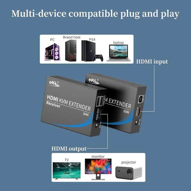 Supports transmitting HDMI and USB signals over single UTP cat5e/6 cables up to 60m/196ft.