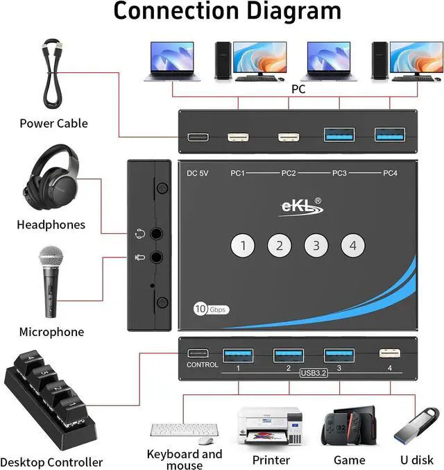 Connect More Devices with USB A & C PortsEquipped with 3 USB A 3.2 and 1 USB C 3.2 output ports, the switch supports a wide range of peripherals such as keyboards, mice, external drives, webcams, printers, and gaming controllers. With both port types available, you can connect nearly any accessory without worrying about interface compatibility.