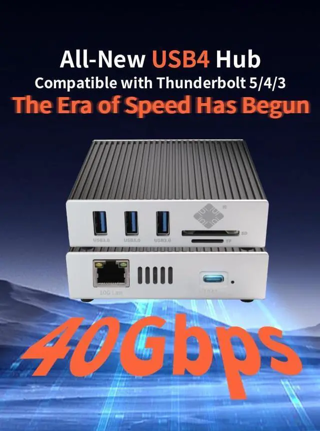 Ultra fast USB 4.0 40Gbps 6-in-1 USB-C Hub features one 10G RJ45 Ethernet Port, three USB-A 3.0 ports, one TF card slot, and one SD card slot.