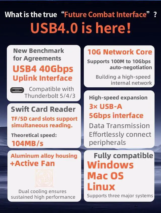 USB 4.0 (40Gbps) Type-C (compatible with Thunderbolt 3/4/5) 6-in-1 Docking Station (Hub)