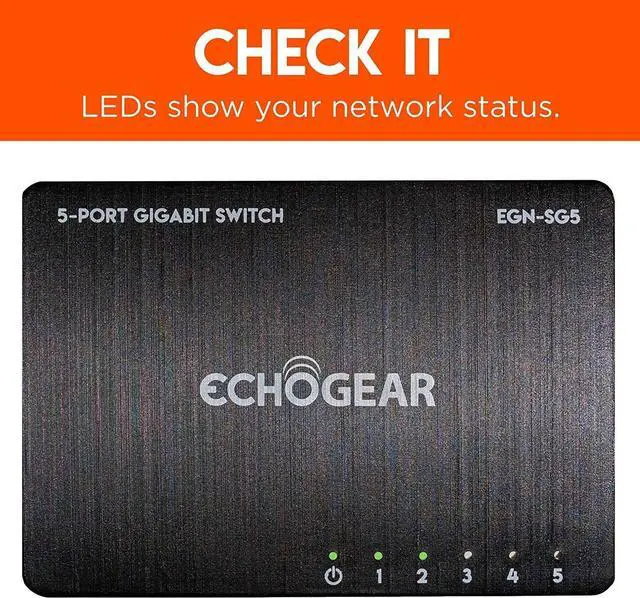 Expand your wired network capabilities with an Echogear Gigabit Ethernet Switch. It has all the fancy specs for speedy & reliable network performance, plus it's incredibly easy to use. Nothing is more frustrating than laggy internet or buffering. Gaining extra Ethernet ports can help perfect your home theater, office, or gaming setup. Every device you connect to this splitter can get speeds up to 1 Gigabit (1000mbps). Just plug in an Ethernet cable from your modem or router then connect up to 4 other devices to the Ethernet hub.