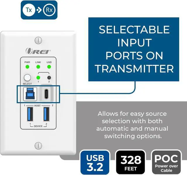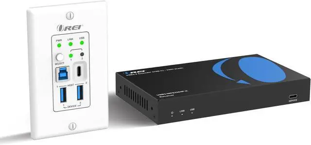 Versatile USB Connectivity on Both Ends The wall-plate transmitter includes USB-C and USB-B host ports plus two USB-A device ports, while the receiver provides two USB-C (1.5A, 1.0A) and 2x USB-A (1.5A, 1.0A) device ports. Ideal for long-distance USB signal extension between computers and peripherals such as webcams, PTZ cameras, keyboards, mice, microphones, speakerphones, printers, scanners, and touch displays