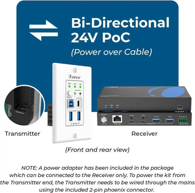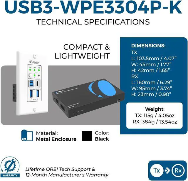 Lifetime Full Orei Support & 12 Month Warranty Contact us for any reason, we are based in the US for full local support. Includes: Instructions Manual, 24V Power Adapter, Transmitter unit, Receiver unit, Wall Plate Cover, USB-B Cable.