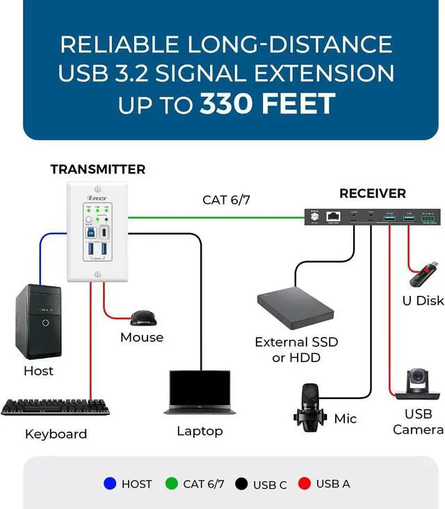 HDBaseT USB 3.2 Wall Plate Extender Kit Extends USB-A or USB-C devices up to 300 ft (100 m) over a single Cat6/Cat7 Ethernet cable using HDBaseT technology. Supports USB 3.2 Gen 1 (5Gbps) transmission for high-speed peripherals, with best performance achieved using high-quality shielded cable.