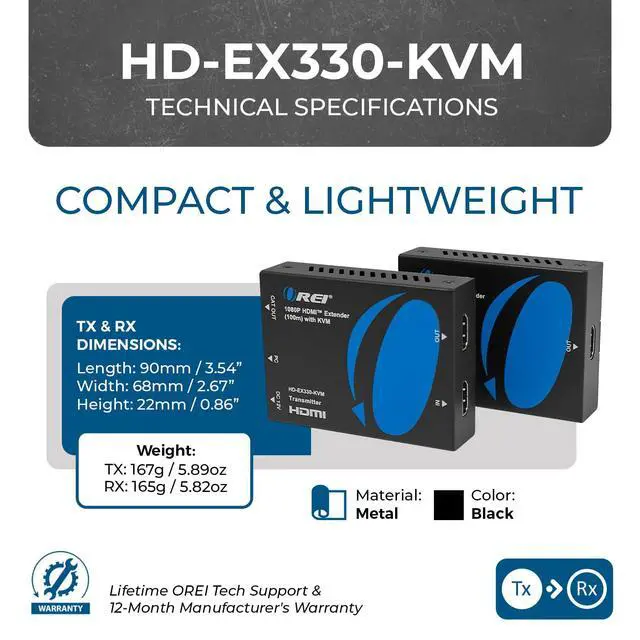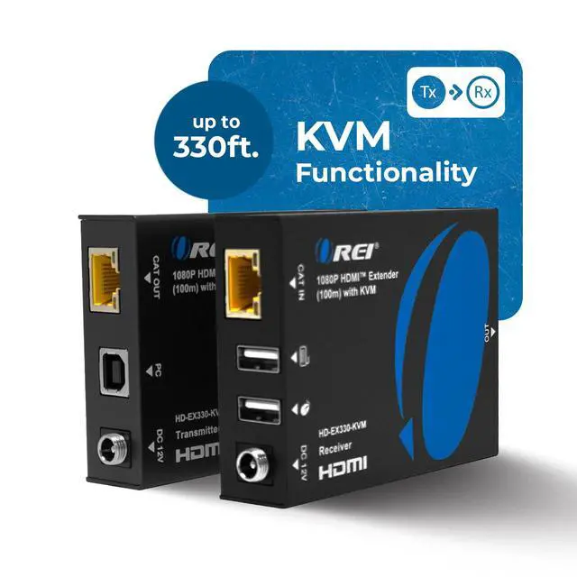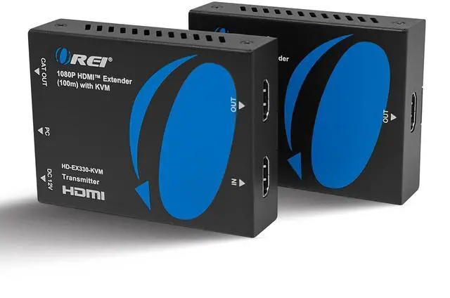 OREI KVM HDMI Over Ethernet Extender Balun Over CAT6/7 Cable 1080p Upto 330 Feet - 2 USB 1.1 Ports, Supports Keyboard and Mouse USB HDMI Loop Out, Power Over Cable (HD-EX330-KVM)
