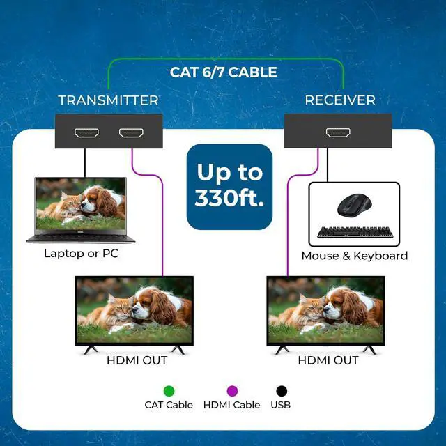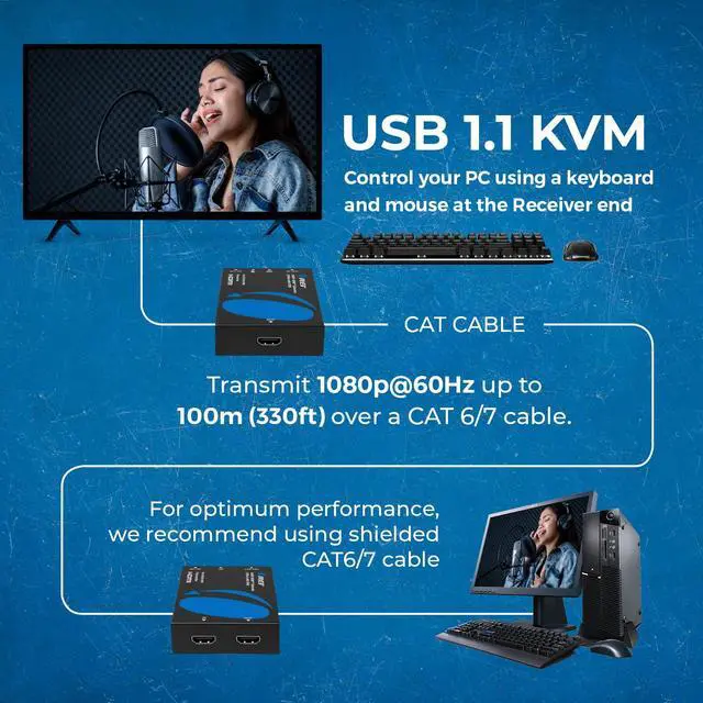 1080p HDMI Extender over Ethernet Balun with KVM - up 100 Meters 230 Feet Range Over LAN CAT6/7 Cable with High Quality CAT6 cable | Low Latency | OREI Technology for lossless and lag-free video transmission. Control your Mouse and Keyboard remotely with KVM Functionality. Power Over Cable requires only 1 power adapter.