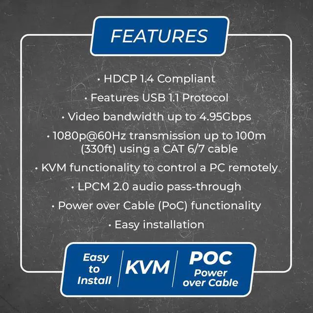 USB KVM Extension 1.1 - This feature allows you to control your PC through Keyboard/Mouse remotely at the receiver end. HDMI Loop-out on transmitter unit to connect an HDMI display by the source, Full HDCP Compliant.