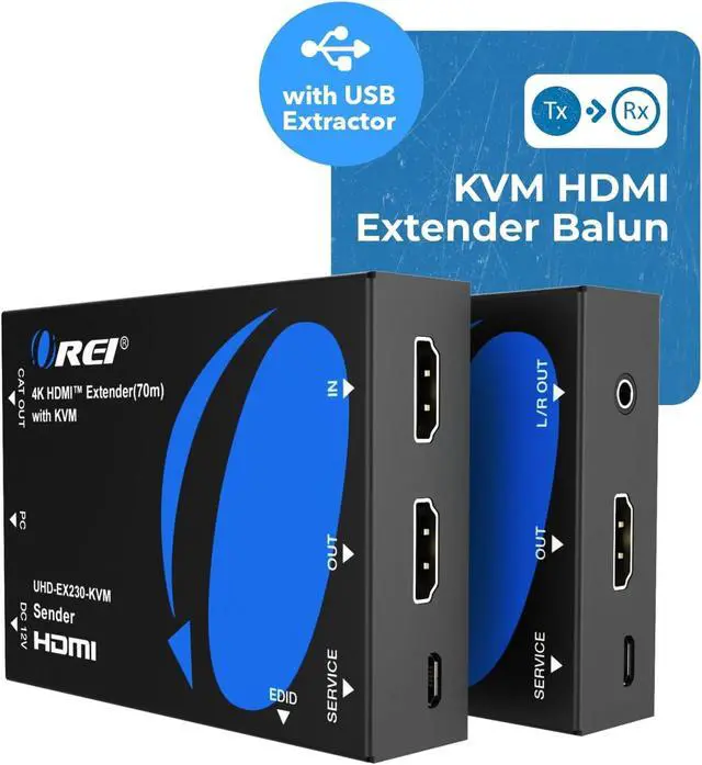 OREI KVM 4K HDMI Over Ethernet Extender Balun Over CAT6/7 Cable 4K@60Hz Upto 230 Feet - 2 USB 1.1 Ports, Supports Keyboard and Mouse USB HDMI Loop Out, Power Over Cable