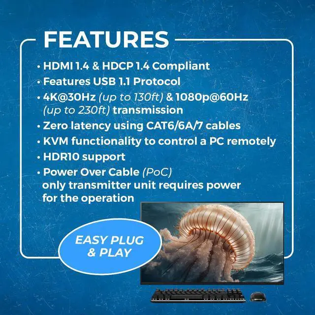 USB 1.1 KVM Extension: This feature allows you to control your PC through Keyboard/Mouse remotely at the receiver end. Full HDCP Compliant