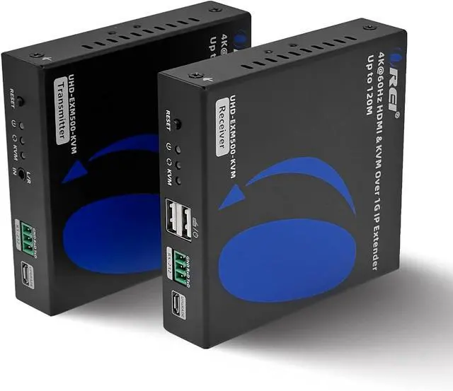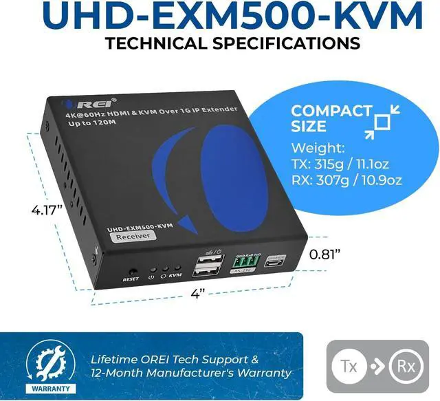 The extender features OREI technology for high-definition and low-latency transmission. The device supports video resolutions upto 4K@60hz. One-way IR Transmission from Receiver to the Transmitter; enabling control of the source device from the receiver end.