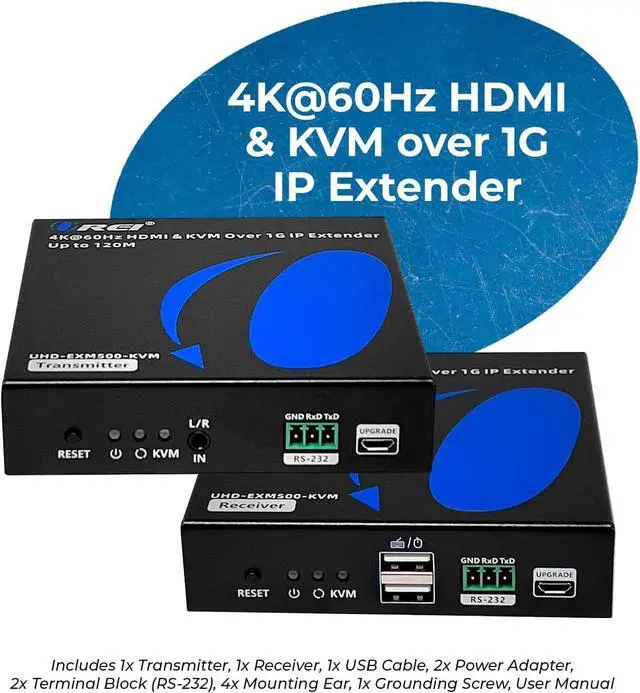 4K KVM HDMI Over IP: Extends USB & HDMI signals up to 400 Feet (120 meters) at full 4K 4:4:4 @ 60hz by a Cat6 cable. Either Point to Point connection, or One to Many Connection (sold separately) over 1G Network Switch (sold separtely). RS-232 Support. The device comes with a dual voltage supply using a US plug, and an adapter/converter is provided for international use.