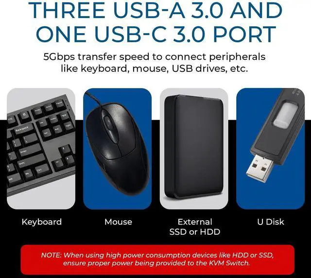Dual-Input KVM Switch with 2x HDMI & USB-C + USB Hub Features 2x HDMI and 1x USB-C input (with PD passthrough) for seamless switching between two source devices such as laptops, PCs, and desktop computers. Share 3x USB-A ports and 1x USB-C data port across both devices to control keyboards, mice, and USB peripherals with ease. Instantly boost productivity by toggling between your work and personal laptop using a Dual monitor Extended Display and input devices. Important Note: The USB-C port on your laptop must support DisplayPort ALT Mode and USB control protocols for proper video and USB switching functionality.