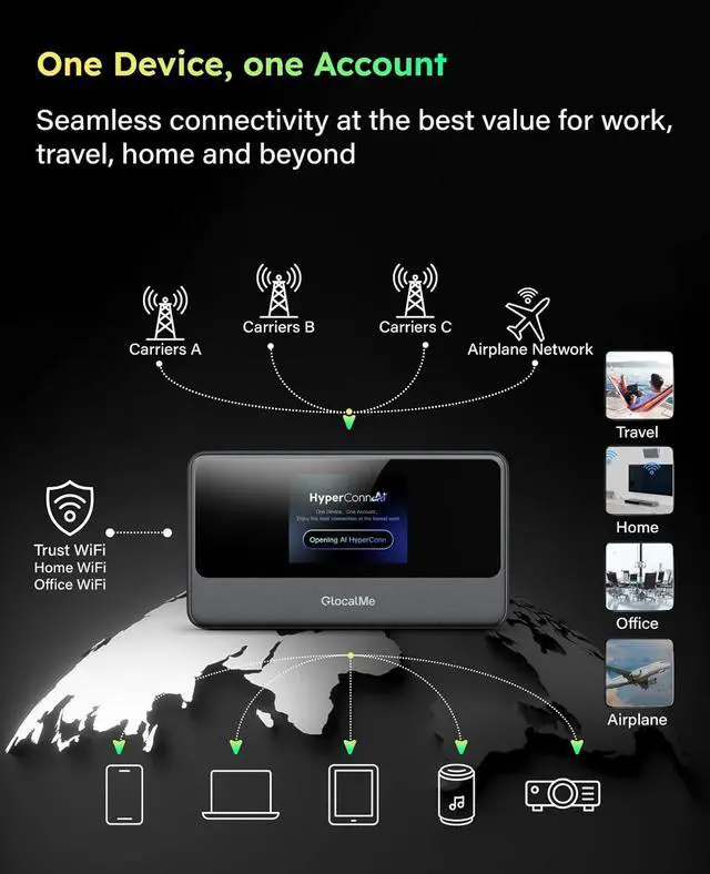 HyperConn & CloudSIM Technology: With patented HyperConn and CloudSIM technology, ensuring WiFi access, congestion monitor and AI-driven network reselection. Automatically connects to Airplane WiFi, never go offline. One device, one account, no more internet anxiety. And the 2-inch 1080P touchscreen enhances usability.