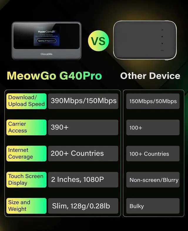 2025 Upgraded Hotspot Device: Introducing GlocalMe MeowGo G40Pro, an upgraded portable WiFi device featuring 4G+ Cat13 high speed technology. Experience faster and more stable connections with download speeds of up to 390Mbps and upload speeds of up to 150Mbps, that's 3 times faster than standard 4G!