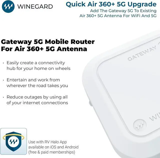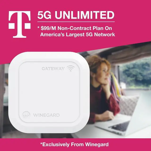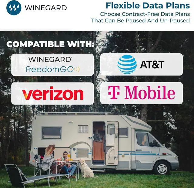 Carrier flexibility & dual SIM: works with AT&T, Verizon, T-Mobile (incl. Winegard FreedomGO plans and optional T-Mobile $99/mo Unlimited); dual mini-SIM (2FF) slot for easy carrier swaps.