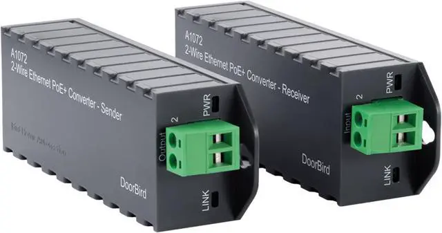 The DoorBird 2-Wire Ethernet PoE Converter is probably the worldâ s smallest and most powerful converter. It allows you to transfer network data (Ethernet) and power (PoE) with a simple two-wire cable over long distances. For example; existing buildings with a simple two-wire bell wire can be equipped with network technology without having to retrofit any network cables.