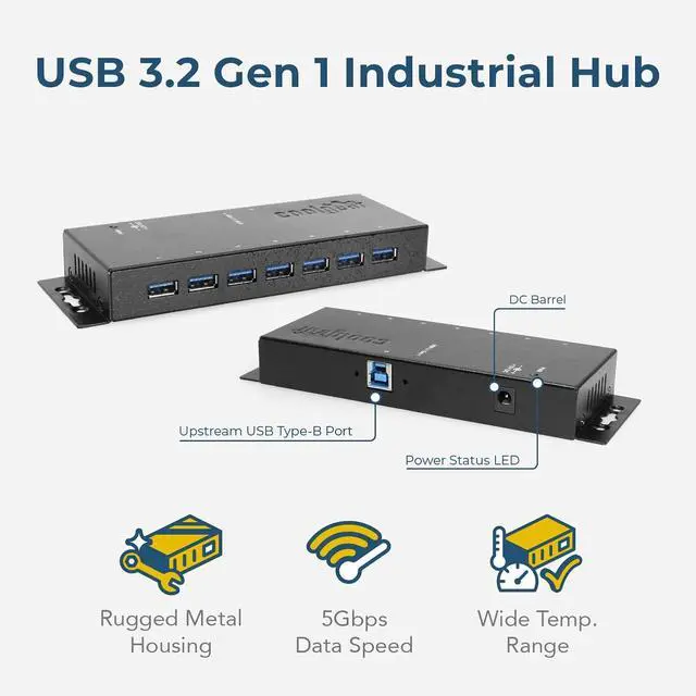 [ Secure Mounting ] : Equipped with built-in flat surface mountable brackets, the rugged metal chassis ensures secure installations in a variety of demanding environments. A screw-lock USB Type-B upstream port ensures stable connections and prevents accidental disconnections.