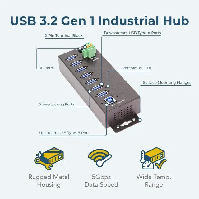 Industrial Grade | +7~48V DC Input | Surface Mountable | DIN Rail | 5 Gbps | Screw Lock