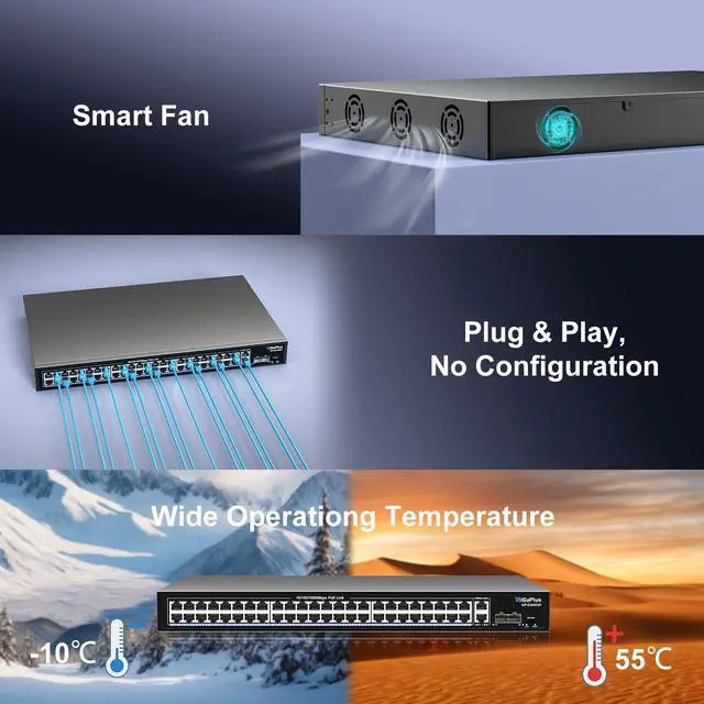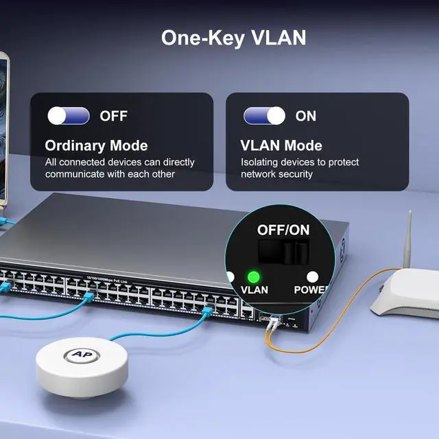 One-Key VLAN mode for enhanced security: The 48-port power over ethernet switch features a One Key VLAN mode that isolates the 1-48 ports from each other while still communicating with the uplink ports, improving network security and bandwidth utilization.