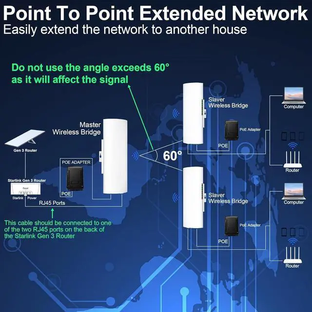 [Compatible with Star link Gen 2 Ethernet Adapter or Gen 3 Router]: The point to point wireless bridge is compatible with Starlink's second-generation Ethernet adapter and third-generation routers, facilitating seamless integration with the Star link satellite internet system. Regardless of which generation of Star link devices users have, they can achieve reliable network connections through this product, enjoying the convenience brought by Star link satellite internet.