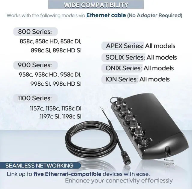 Network Flexibility: Includes a power cable designed to connect to your main fuse panel or battery switch with an inline fuse for safe, secure power. Avoid connecting directly to a battery without a fuse and switch to maintain optimal safety. Supports daisy-chaining up to three AS ETH 5PXG switches, allowing for complex networking while limiting the total network to four Humminbird fish finders. Connect multiple Ethernet accessories and up to three sonar modules (SM1000, SM2000, SM3000) simultaneously without duplicate devices on the same network