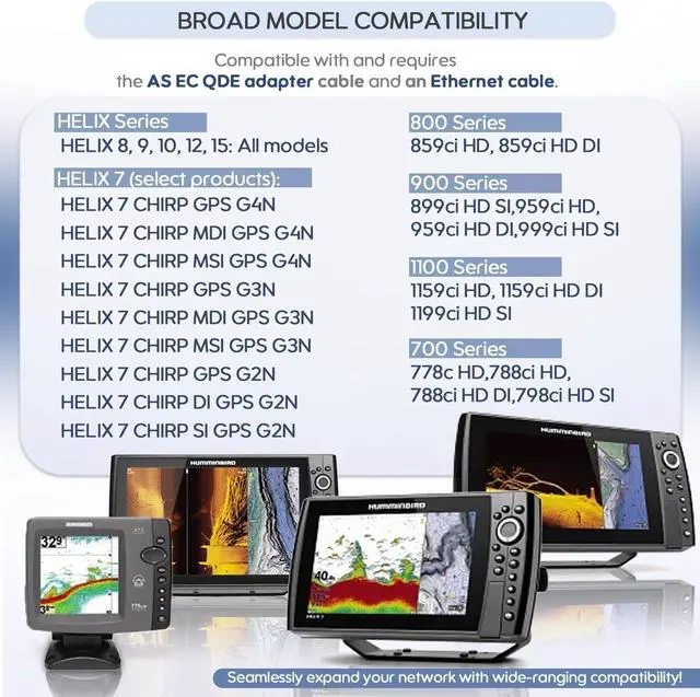 Model Compatibility (Adapter required): Compatible with and requires the AS EC QDE adapter cable and an Ethernet cable: all HELIX 8, all HELIX 9, all HELIX 10, HELIX 12 and all HELIX 15 models, select HELIX 7 products: (HELIX 7 CHIRP GPS G4N, HELIX 7 CHIRP MDI GPS G4N, HELIX 7 CHIRP MSI GPS G4N, HELIX 7 CHIRP GPS G3N, HELIX 7 CHIRP MDI GPS G3N, HELIX 7 CHIRP MSI GPS G3N, HELIX 7 CHIRP GPS G2N, HELIX 7 CHIRP DI GPS G2N, HELIX 7 CHIRP SI GPS G2N) Compatible with and requires the AS EC QDE adapter cable and an Ethernet cable: 778c HD, 788ci HD, 788ci HD DI, 798ci HD SI, 859ci HD, 859ci HD DI, 899ci HD SI, 959ci HD, 959ci HD DI, 999ci HD SI, 1159ci HD, 1159ci HD DI, 1199ci HD SI