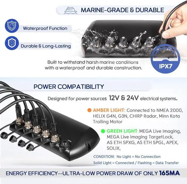 Smart LED Status Indicators: Features amber power and dual-color connection lights to help you monitor device connectivity and data transfer at a glance. Amber Light: Connected to HELIX G4N, G3N, NMEA 2000, MK Trolling Motor, CHIRP Radar. Green Light: Connected to APEX, SOLIX, MEGA Live Imaging, MEGA Live Imaging TargetLock, AS ETH 5PXG, AS ETH 5PGL. Solid Light = Connected | Flashing = Data Transfer | No Light = No Connection