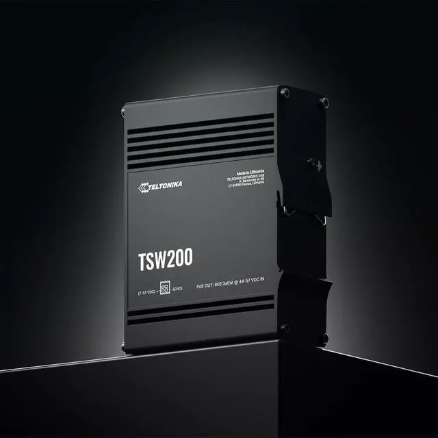 TSW200 is an industrial Ethernet switch with 2 SFP ports for long-range Fiber-optic communication and 8 Gigabit Ethernet ports that support IEEE802.af and IEE802.3at Power-over-Ethernet standards.