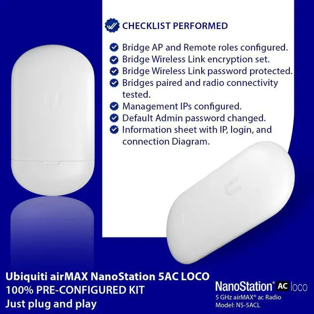 Experience the ultimate in wireless connectivity with the LOCO5AC Wireless Bridge. Pre-configured for your convenience, this high-performance device offers a powerful 5GHz connection with speeds exceeding 450 Mbps, ensuring fast and reliable data transmission for your network needs. The LOCO5AC is designed for easy plug-and-play setup, allowing you to quickly establish a robust wireless link without the hassle of complex configurations. Its advanced technology provides excellent noise immunity and long-range capabilities, making it ideal for various applications, including point-to-point and point-to-multipoint configurations. Built to withstand harsh outdoor environments, features a durable, weather-resistant design. Whether you're extending your network across buildings, connecting remote locations, or providing wireless internet access to a large area, the LOCO5AC delivers exceptional performance and reliability. This comprehensive package includes 2 Paired LOCO5AC devices, 2 POE Injectors with power cords, 2 Pole and Wall mounts, and an easy-to-follow Installation guide.