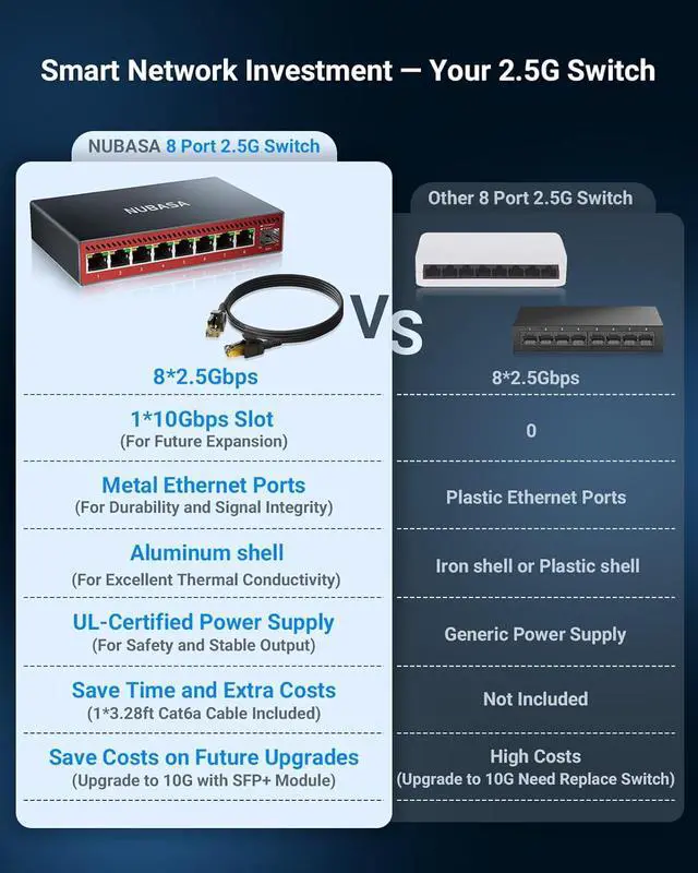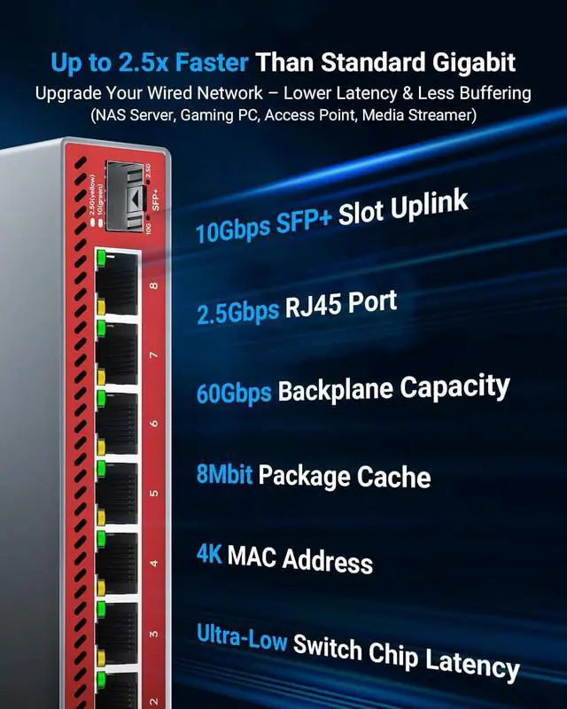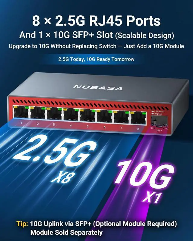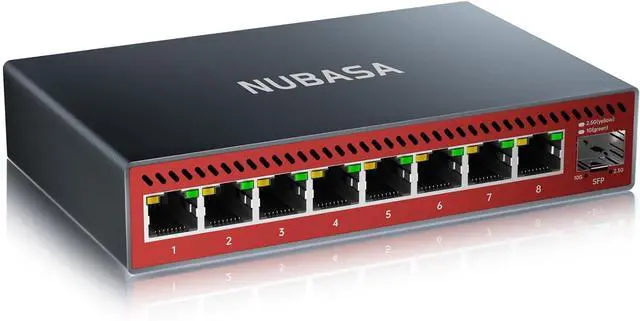 Experience faster data transfers with the NUBASA 8-port 2.5G ethernet switch, featuring eight 2.5Gbps RJ45 ports and one 10Gbps SFP+ uplink port. Ideal for high-speed connections between NAS, gaming consoles, PCs, and workstations, supporting 10/100/1000/2500Mbps auto-negotiation for seamless compatibility