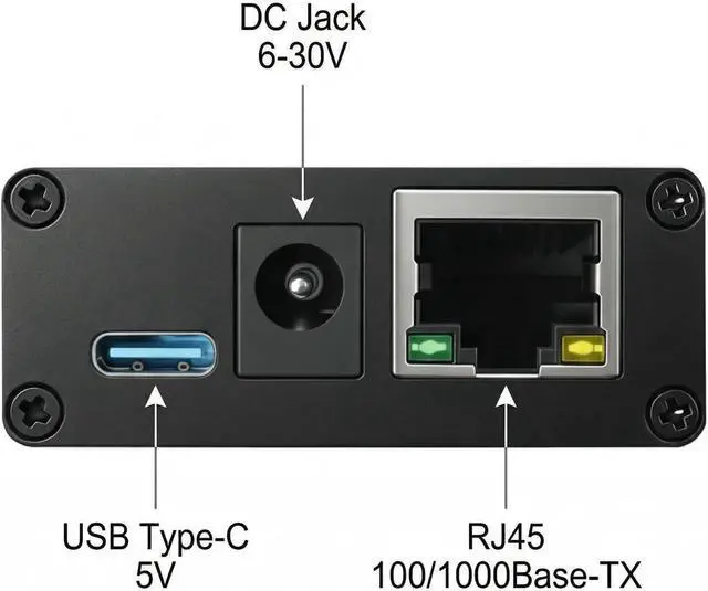 Robust MATENET & RJ45 Interfaces: Features MATENET (2302461-9) T1 port for automotive compatibility and RJ45 TX port; powered flexibly via USB Type-C (5V ±0.5V, 355mA) or DC Jack (6-30V) for versatile deployment in vehicles or industrial settings