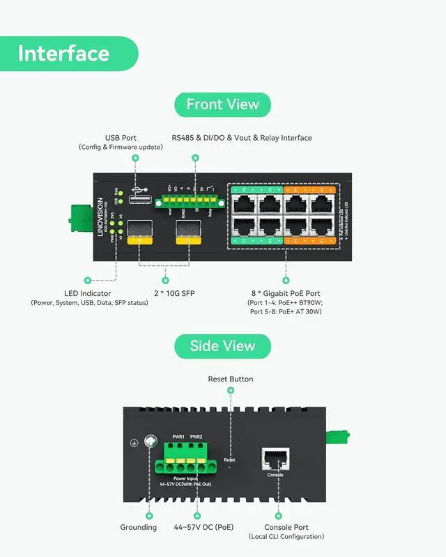 LINOVISION Industrial 8-Port L2 Managed PoE++ Switch with 2X 10G SFP Uplinks and RS485 for Industrial Automation