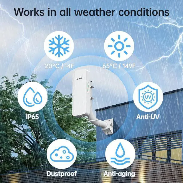 Built to Withstand the Elements: Our wireless bridge features an IP65-rated design, providing robust protection against dust, rain, and extreme temperatures. Whether it's scorching heat, freezing cold, or heavy downpours, this bridge is engineered to perform reliably outdoors. Note that the router in this kit is not waterproof (unlike the IP65-rated wireless bridge) and must be used indoors.