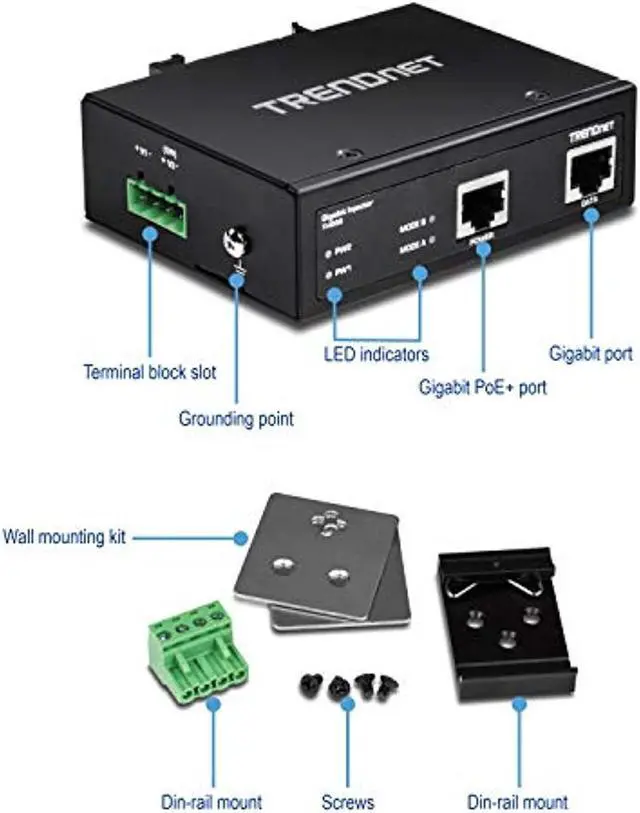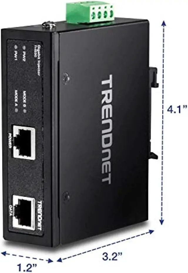TRENDnets TI-IG30 is a reliable IP30 rated Industrial Gigabit PoE+ Injector with hardened components rated for extreme industrial environments. Connect the TI-IG30 to a non-PoE Gigabit switch and then run an Ethernet cable up to 100 meters (328 ft. ) to network a PoE, PoE+, or high power PoE+ device. Dual redundant power inputs (power supply sold separately: TI-S12048) with overload current protection support zero downtime applications. Both DIN-rail and wall mount hardware is included. PACKAGE CONTENTS TI-IG30 Quick Installation Guide Removable terminal block DIN-rail and wall mount kit