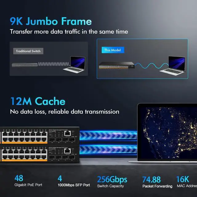Gigabit Ports: 48 gigabit ethernet ports, 4 gigabit SFP, switching capacity is 256Gbps, each port can reach 1G rate at the same time, with higher data throughput. 16K Mac address table, more devices can be connected and can be used in large networks
