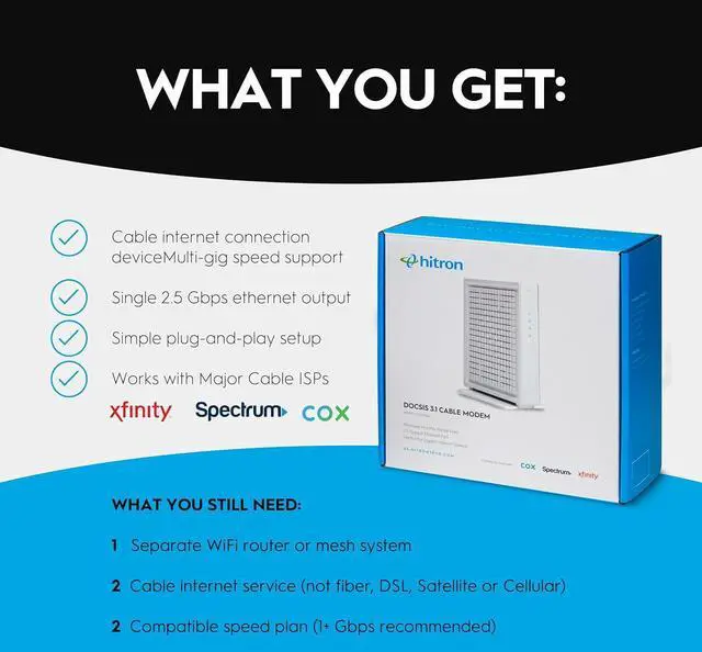 The CODA56 DOCSIS 3.1 modem is compatible with cable Internet service plans up to 2.5 Gbps, including Comcast Xfinity, Charter Spectrum, Cox Gigablast, Astound, Grande, RCN, Wave & Zito Media. Not compatible with Verizon, AT&T, CenturyLink, DSL providers, DirecTV, DISH and any bundled voice service.