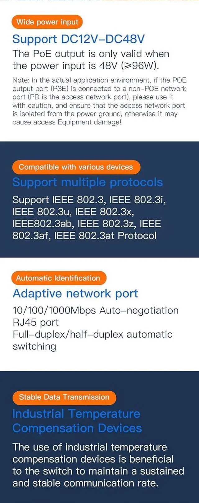 Plug & Play: Easy to set up with no software to install or configuration needed, just plug in the power cable, connect the Ethernet cable to your device, automatically detect the powered device and supply PoE power to the network.